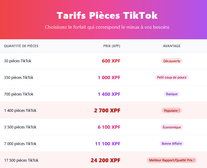 Tarifs pour pièces TikTok